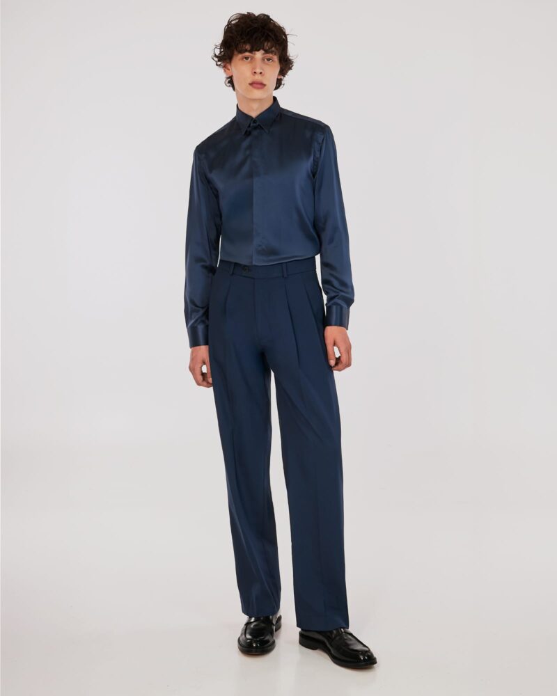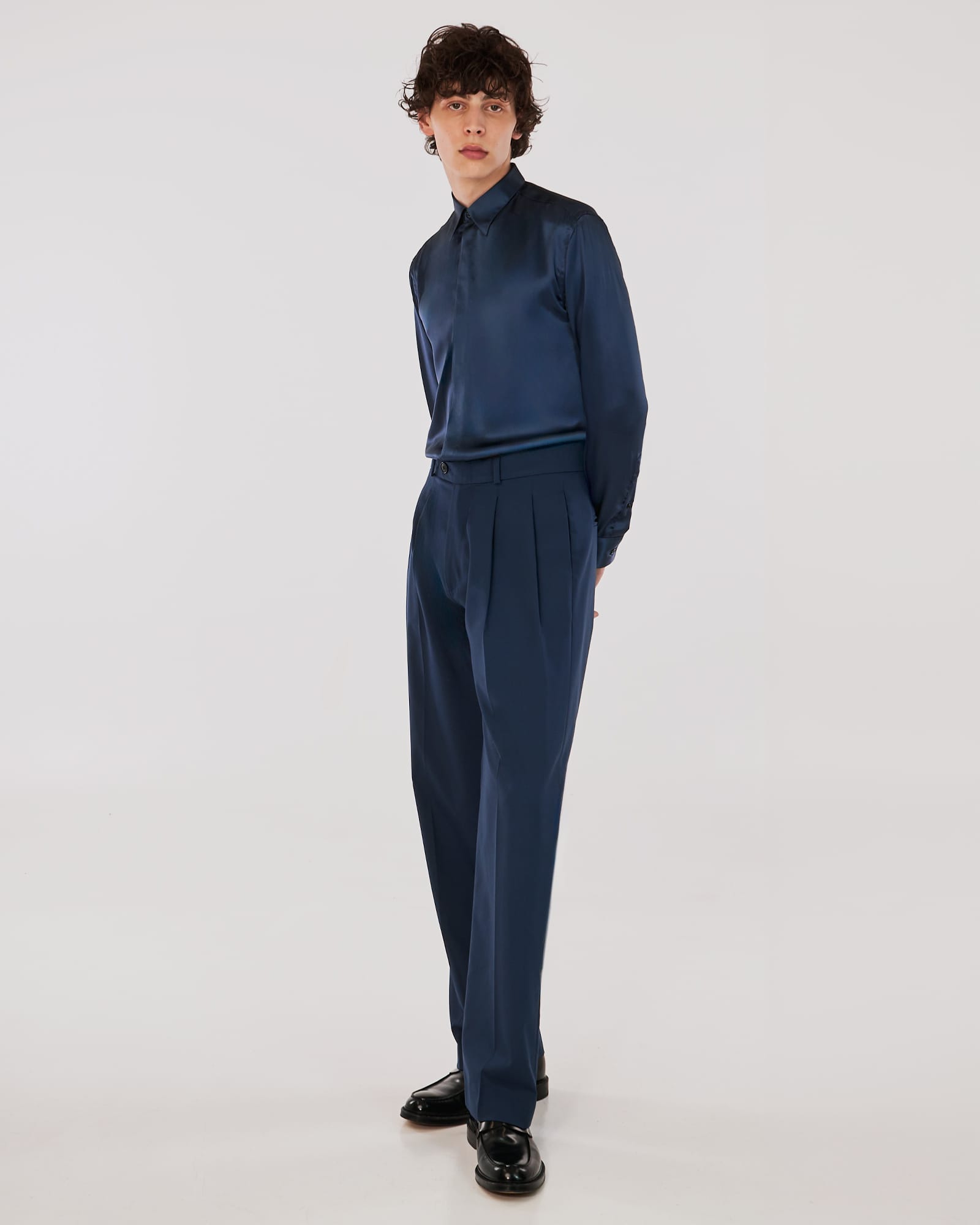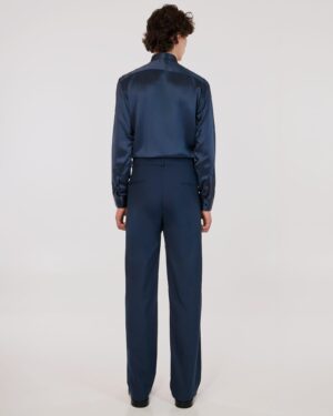 Παντελόνι σε ίσια γραμμή με δυο πιέτες, σε μπλε χρώμα με τσέπες στο πίσω μέρος από 100% cool wool.