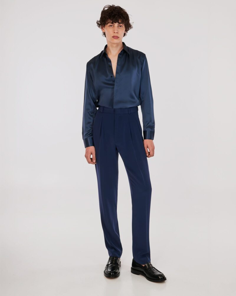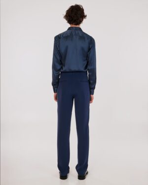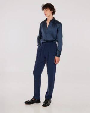 Παντελόνι σε ίσια γραμμή με δυο πιέτες, σε navy μπλε χρώμα , τσέπες στο πίσω μέρος από 100% μετάξι.